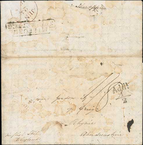 Turkey. 1836 (Apr 23) Entire letter from "Aydin in Ionia" to Rhynie with scarce "MILFORD / SHIP LETTER" (S3) on reverse, disinfected with vinegar and three chisel slits. Photo on Page 70. (Image1)