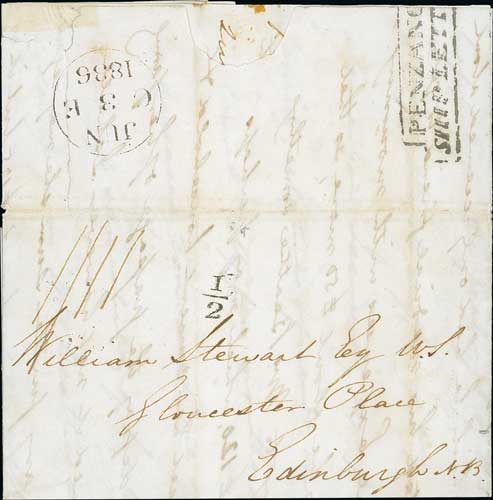 Madeira. 1836 Entire letters from Madeira with ship letter handstamps of Penzance, Falmouth or Deal, the first with a superb strike of the rare tiny "½" handstamp of Exeter. (3). Photo on Page 70. (Image1)