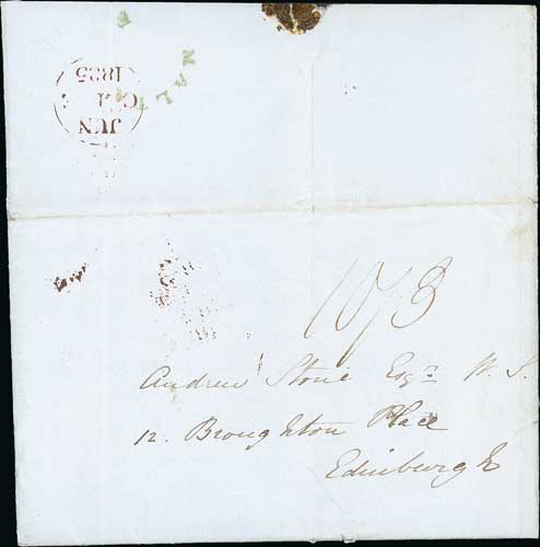 Malta. 1835 (Apr 23) Entire letter from Malta to Edinburgh carried by packet to Falmouth, backstamped with a fine undated "MALTA / F" in green, charged the triple rate of 10/3, the additional ½d fee not