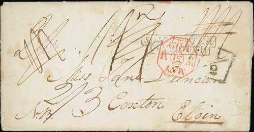 Jamaica. 1815-36 Entire letters including 1819 Falmouth Ship Letter in red, the others sent by packet, an 1815 letter with "ANNOTTO BAY / JA" backstamp sent to Kelso and therefore exempt from the additional "½" charge (Kelso not on a mail coach