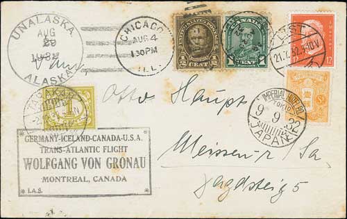 578 1932 (July/Aug) Covers and cards flown over various north American legs including U.S cards flown from Milwarukee to Minneapolis or Juneau and posted upon arrival, other flown items with Canada stamps cancelled at Montreal (2) or Winnipeg (4), or U.S stamps cancelled at Chicago (3), three signed by von Gronau or other crew members. (11).