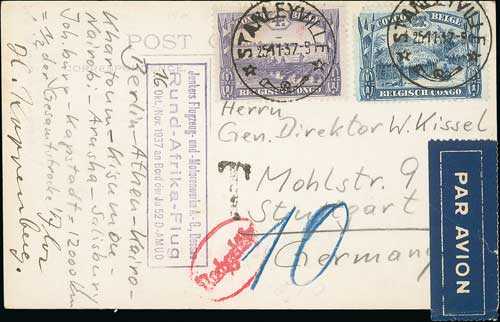 584 image1937 (Nov 25) Picture postcard to Germany, written at Cape Town (Nov 11), posted nine days later from Stanleyville franked Belgian Congo 25c + 4f, with a fine boxed flight cachet, message signed by F.H Koppenburg details the places stopped at en route, handstamped "T" and "nachgebuhr", charged 10pf. Fine and scarce. Photo on Page 74. (Image1)