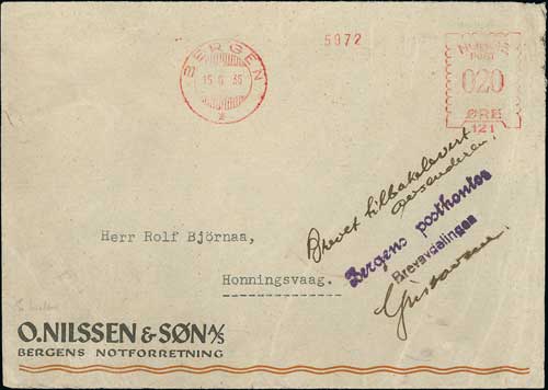 605 image1936 (June 15) Cover from Bergen to Honningsvaag with 20ore meter, recovered from the JU.52 "Havorn" which crashed into cliffs at Sognfjord on June 16th killing six crew and passengers and destroying most of the mail. Handstamped "Bergens postkontor / Brevavdalingen" with manuscript endorsement, the reverse handstamped "Gjenfunnet post / fra "Havorn"". Scarce, a few letters recovered from the base of the cliffs. N.360616. Photo on Page 74. (Image1)
