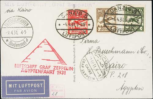 614 image1931 Egypt Flight, covers and cards posted in Danzig, Switzerland, Netherlands or Austria, all flown to Cairo with the red flight cachet, Friedrichshafen and Caire Graf Zeppelin datestamps, four good foreign acceptances. (4). Photo on Page 74. (Image1)