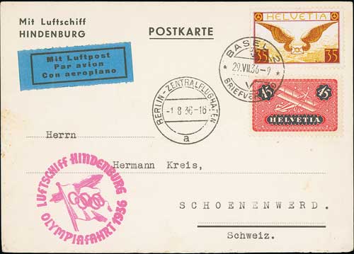 616 image1936 Hindenburg Olympic Flight, covers and cards from Germany (6), Liechtenstein, Belgium, Netherlands Indies (4), Netherlands (2), Switzerland and Austria, all flown on the "Hindenburg" Olympic flight, all with flight cachets. Also nine cards with cancels of the Olympic Stadium, four also with cachets. A good lot with some scarce foreign acceptances. (25). Photo on Page 74. (Image1)