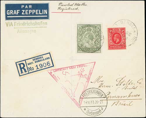 617 imageBritish Somaliland. 1933 (Sep 11) Registered cover from Berbera to Pernambuco franked 1a + 1r, bearing a "Par Graf Zeppelin" label and handstamped "Via Friedrichshafen", with Friedrichshafen c.d.s (Oct. 14) and 1933 Sudamerika - Chicagofahrt Graf Zeppelin cachet, backstamped at Aden and Pernambuco. A rare Zeppelin acceptance from Somaliland. S.238. Photo on Page 74. (Image1)