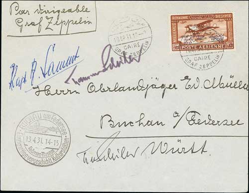 620 imageEgypt. 1931 Egypt Flight, covers (6) and postcards (9), four posted on board franked by German stamps (to Egypt, Czechoslovakia or Austria, all with Caire Graf Zeppelin c.d.s), eleven others from Egypt with Zeppelin cancels of Cairo (7), Alexandria (3) or Port Said, franked by the Zeppelin 50m (5, two 1951 error), 50m + 50m, 100m (3) or 100m + Air 27m, another cover with ordinary stamps. Also four photos of Egypt taken from the Zeppelin and the two Egypt Zeppelin stamps in mint pairs and singles. A good lot, one cover to Turkey with the Zeppelin cachet in black, one cover signed by Captain Albert Sammt and two crew members. (25). Photo on Page 80. (Image1)