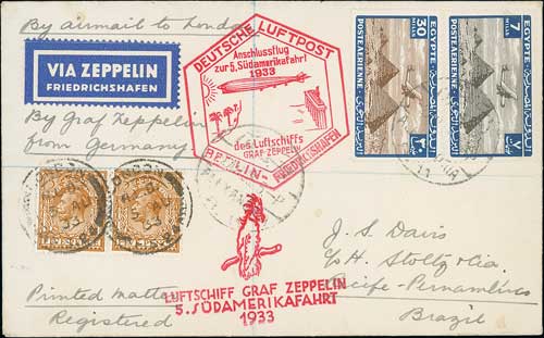621 imageEgypt. 1933 (Aug 2) Registered cover from Alexandria to Brazil sent via London and Zeppelin from Germany, with Egypt 7m air pair, G.B 5d pair cancelled in London (Aug 5), cachets for the Berlin to Friedrichshafen special flight and fifth South American flight, backstamped at Pernambuco (Aug 22), fine and unusual. S.226. Photo on Page 80. (Image1)