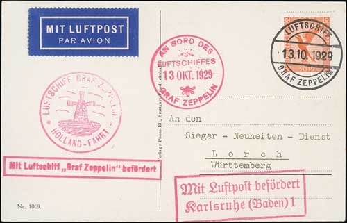 Germany. 1929 (Oct 13) Picture postcard posted on the Graf Zeppelin Holland flight, 50pf air stamp cancelled by "LUFTSCHIFF / GRAF ZEPPELIN" Bordpost c.d.s, three differing Zeppelin cachets, dropped over