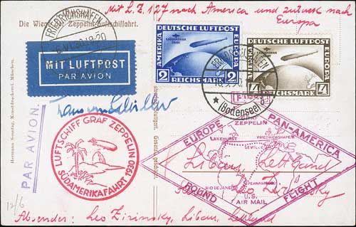 round flight, cachets of both flights and Freidrichshafen c.d.s (June 6), signed by Captain Hans von Schiller (navigating officer on LZ 127, subsequently captain of LZ 130). A fine card, carried on the entire round flight. S.57H. Photo on Page