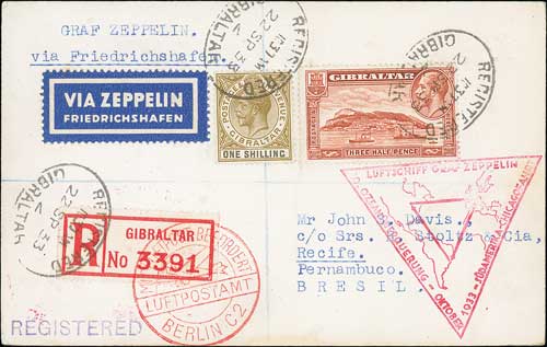 Gibraltar. 1933 (Sep 22) Registered postcard to Brazil franked Gibraltar 1½d + 1/-, carried on the special flight from Berlin to Friedrichshafen and then on the Graf Zeppelin Chicago flight to Pernambuco