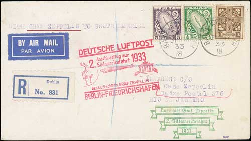 Ireland. 1933 (May 31) Registered cover from Dublin to Rio de Janeiro franked ½d + 5d + 10d, carried on the special flight from Berlin to Friedrichshafen and then on the Graf Zeppelin second South American