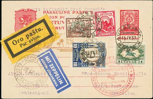 Lithuania. 1932 (Apr 15) 36c Postcard franked 60c, 1L, 5L and 10L, from Kaunas to Recife, carried on the special flight from Berlin to Friedrichshafen then on the third South American flight, cachets of both
