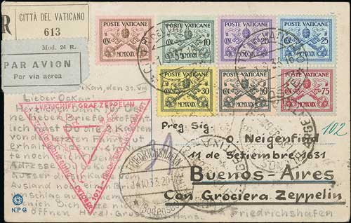 Germany and carried on the Graf Zeppelin Chicago flight, red flight cachet and datestamps of Friedrichshafen (Oct 14) and Buenos Ayres (Sep. 11 & Oct. 19), unusual and scarce. S.238. Photo on Page 96. (Image1)