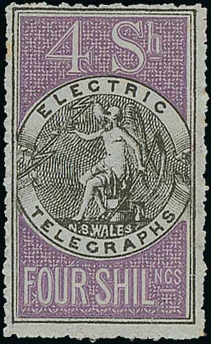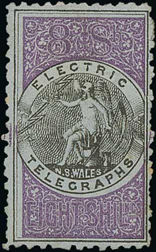 752 imageNew South Wales - Telegraph Stamps. 1871 Electric Telegraphs 1d - 8/- set of eight, the 8/- perf 10, 6d with tiny surface fault, 6/- with toned perf and 8/- without gum, otherwise fine mint, a rare set. S.G. T1/8, £6,050. (8). Photo on Page 16. (Image1) (Image2) (Image3) (All Images)