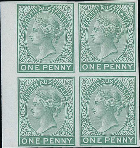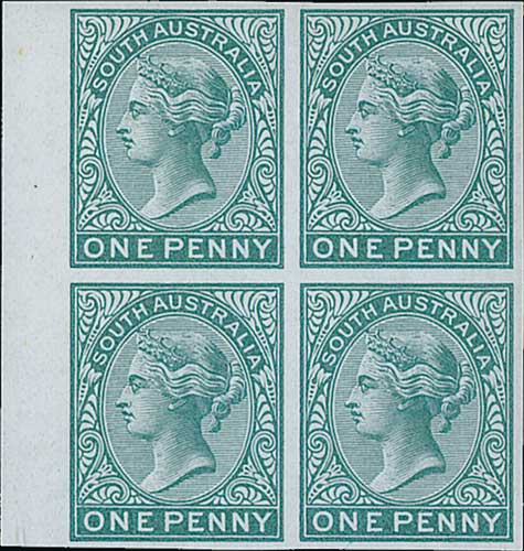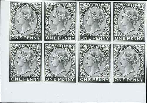 754 imageSouth Australia. 1875 1d, Imperforate plate proofs, corner block of eight in black on glazed card, blocks of eight and four in blue green and two blocks of four in pale green on gummed unwatermarked paper, all fine. (28). Photo on Page 42. (Image1) (Image2) (Image3) (All Images)