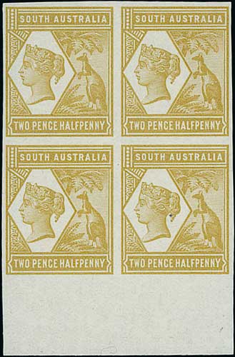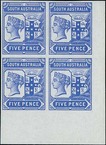 755 imageSouth Australia. 1894 2½d and 5d Imperforate colour trials in blocks of four on gummed unwatermarked paper, the 2½d in six differing colours, 5d in seven differing colours, all marginal, very fine. (52). Photo on Page 120. (Image1) (Image2) (All Images)