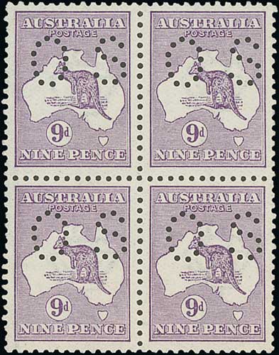 760 image1914 9d Violet block of four each perfined small "OS" type O2, fine mint, upper pair lightly mounted, lower pair unmounted. S.G. O24, £1,300++. Photo on Page 194. (Image1)