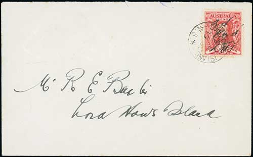 762 imageLord Howe Island. 1930 (Sep. 4) Cover addressed within Lord Howe Island franked River Murray Tercentenary 1½d with manuscript surcharge "2d Paid PM LHI" tied by a Lord Howe Island c.d.s. When the Lord Howe Island Post Office ran out of 2d stamps the Postmaster was authorised to surcharge 1½d stamps in manuscript; 260 stamps were surcharged and used between August 23rd and October 17th 1930. A fine and scarce cover (S.G. £750 as a single stamp). Photo on Page 96. (Image1)