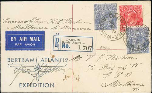 766 image1932 (Dec 10) Hans Bertram Australia to Germany return flight, registered cover flown from Melbourne to Darwin, posted upon arrival franked 8d, signed by Bertram with the "BERTRAM ATLANTIS / EXPEDITION" cachet, fine and scarce, just twelve covers flown. AAMC 240, $600. Photo on Page 96. (Image1)
