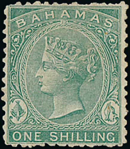 786 1880 1/- Green perf 14 on thin paper, upper right pane of sixty used with 1881 (Oct 2) Bahamas datestamps, surface scrapes to two stamps, small faults to three corner stamps, probably the only recorded complete used pane. S.G. 39b, £1,800+. (Pane of 60).