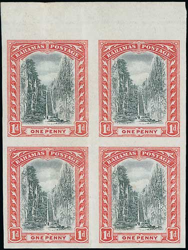 793 image1901 1d Black and red, imperforate plate proof block of four on ungummed inverted watermark Crown CC paper with upper margin, two pressed vertical creases through left pair and central margin, otherwise fine. Scarce, one folded up sheet of sixty stamps was discovered in 1949 with frame plate 2 and vignette plate 2 (which only occurred on the issued 1911 stamp on Multiple Crown CA paper). Photo on Page 120. (Image1)