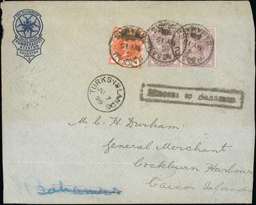 799 imageMissent Mail. 1899 Cover from England to Cockburn Harbour, Caicos Islands, franked ½d vermilion + 1d lilac pair (perfin "H / & Co / LD" of Humber & Co) cancelled in transit by "NASSAU / BAHAMAS" datestamps (May 15), boxed "Missent to Bahamas" (Proud I40) and a "TURKS ISLAND" c.d.s (June 7), reverse with London Foreign Branch datestamp (Apr 25). Horizontal fold, otherwise fine and scarce. Photo on Page 96. (Image1)