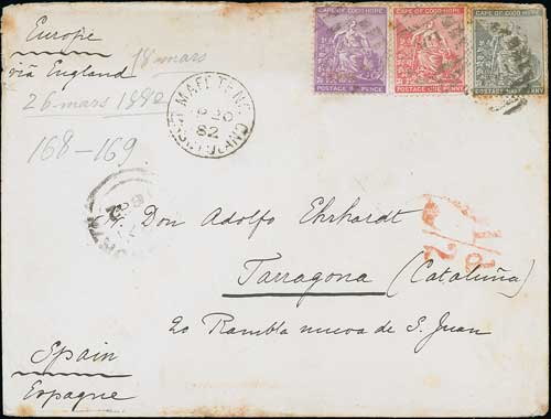 806 image1882 Covers to Spain franked 7½d, bearing Cape ½d + 3d + 4d, or ½d + 1d + 6d, cancelled by "156" numerals with Mafeteng c.d.s below, minor tone marks, early and scarce covers from Basutoland. (2). Photo on Page 96. (Image1)