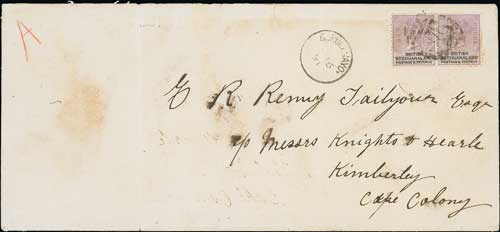 814 Warren Expedition. 1885 (Apr 1) Cover from Edinburgh franked 6d, to "R.W Anstruther Esq., Lieut. Royal Engineers, Bechuanaland Field Force via Cape Town", backstamped at Cape Town (Apr 22) and Barkly (Apr 25). Fine and scarce with the Barkly arrival datestamp.