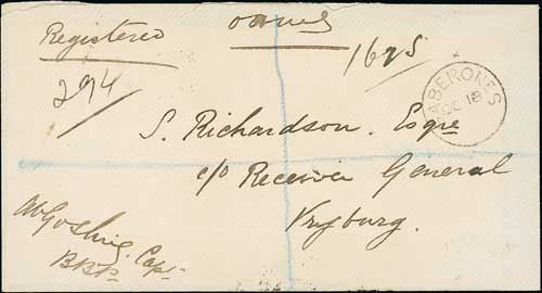 824 image1894 (Oct 18) Stampless registered cover to "S. Richardson Esq., c/o Receiver General, Vryburg", endorsed "Registered" and "O.H.M.S" and signed "A.B Gosling Capt., B.B.P", with "GABERONES" c.d.s (year omitted), backstamped at Mafeking (Oct. 20) and Vryburg (Oct 22). The enclosed letter accompanied a cheque for £15. A very unusual official registered cover. Photo on Page 96. (Image1)