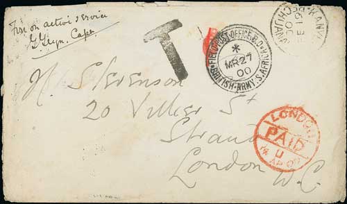 826 imageBoer War. 1900 (Feb 19) Stampless cover to London endorsed "Free on active service, G. Glyn Capt." with Kanye c.d.s (date inverted), Bulawayo backstamp and large "T" applied in Bulawayo, Field Post Office B.O applied at Cape Town (Mar 27), with a red London Paid arrival c.d.s (Apr. 14), minor opening faults, unusual from Kanye. Photo on Page 102. (Image1)