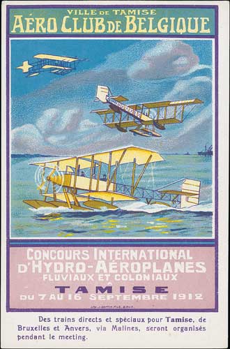 840 image1912 Tamise hydroplane contest, programme, advertising label and picture postcards (27) including three fine coloured poster cards, one card signed by Jean Olieslagers with his cachet. (29). Photo on Page 102. (Image1)