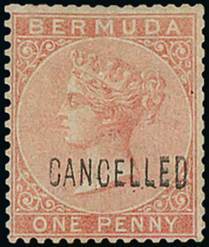 842 image1865 1d Rose-red overprinted "CANCELLED" type D7, a little faded with a few trimmed perf tips, nevertheless very rare and possibly unique. This type D7 overprint only used on a small number of stamps in the De La Rue collection, not recorded by Samuel on this stamp. Photo on Page 130. (Image1)