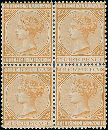 843 image1881 Perf 14x12½ 3d yellow-buff mint block of four, lightly mounted on the upper pair only, the lower pair unmounted, superb. S.G. 10, £720+. Photo on Page 194. (Image1)