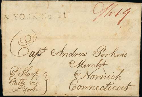 845 image1793 (Nov 3) Entire letter from St. George's to Norwich, Conn. endorsed "P. Sloop Patty via N. York", handstamped "N. YORK. Nov 21" with manuscript "Sh19" (4c ship letter + 15c inland postage). The letter describes the terrible hurricane which destroyed many ships and houses but which the writer's ship somehow sailed through, the price of provisions sold, and the miserable place and people. A fine and rare early letter, very few letters recorded from Bermuda prior to 1806 when the first packet called at the island. Ex Ludington. Photo on Page 102. (Image1)