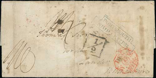 848 image1819 (Aug 7) Entire letter from Dr Riddell on H.M.S "Euralyus" at Bermuda, to Scotland, with "PORTSMOUTH / SHIP LETTER", disinfected at Motherbank with vinegar and two chisel slits. The "Euralyus" struck a rock at St. Martins and is at Bermuda for repairs, fever is raging on shore killing half the garrison and inhabitants at St. Georges, two midshipmen from the ship who visited relatives have died; Riddell finishes the letter from the naval hospital where he also has fever and was delirious for a week. Disinfected mail from Bermuda is very scarce. Photo on Page 104. (Image1)