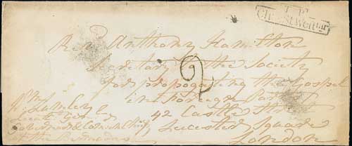 849 image1822 (Feb 23) Entire to the Society for the Propagation of the Gospel in Foreign Parts in London, signed "Wm Lumley, Lieut. Gen. & Governor & Com. In Chief of the Bermudas" privately carried to London and posted in the 2d Post, with "T.P / Chas. St. Westmr" and "2". Sir William Lumley, Governor in 1819-22 and again in 1825, was the most disliked Governor of all time. Very unusual, ex Ludington. Photo on Page 102. (Image1)