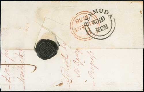 and going to Bermuda to repair their rudder which broke in a storm. The cover with seal cut from reverse, otherwise superb, a unique and remarkable destination for a Bermuda crowned circle cover. With R.P.S Certificate (2000). Photo included on