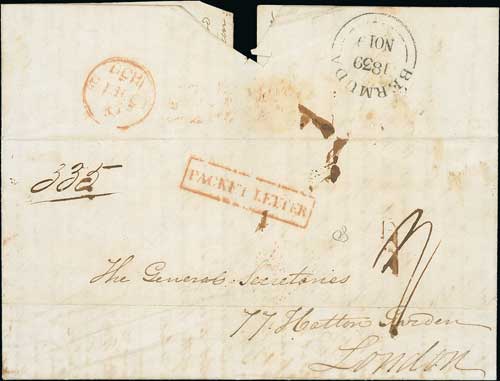 arrival c.d.s (Dec. 21) and red boxed "PACKET LETTER". The right third of the letter sadly cut away, nevertheless a superb strike of one of the rarest Bermuda datestamps, just six examples recorded by Forand and Freeland. Photo on Page 106. (Image1)