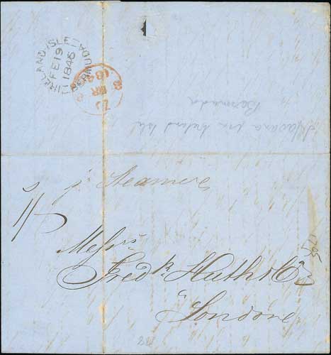 1846 (Feb 9) Entire letter from Havana to London, sent by R.M.S.P Co via Nassau and Ireland Island then R.M.S "Teviot" to Southampton, backstamped "IRELAND-ISLE / BERMUDA" datestamp type PM5 (Feb 19) and a London