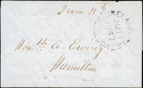 1847 (June 11) Small entire letter to Hon. A. Ewing, Hamilton, with fine "IRELAND-ISLE / BERMUDA" datestamp (PM5). George Clark asks if he can give any reduction in the price of ladies stockings if several pairs