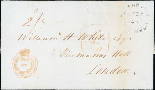 1847 (Apr 23) Entire prepaid 2/- to Freemasons Hall in London, with "IRELAND-ISLE / BERMUDA" datestamp (PM5) and red "PAID / AT / IRELAND ISLE BERMUDA" crowned circle, file folds, fine. The earliest recorded