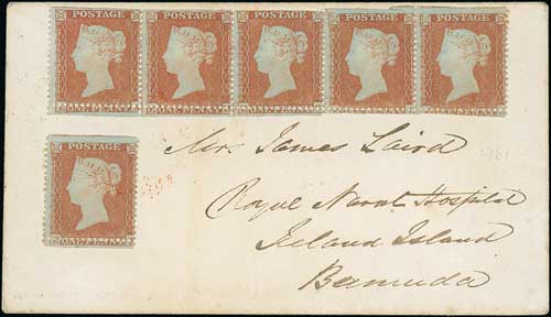1855 (Jan 24) Cover from Jamaica to the Royal Naval Hospital at Ireland Island franked by six G.B 1d reds (single + strip of five, cut out by scissors with upper perfs trimmed), uncancelled but apparently accepted