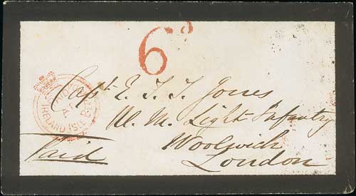 1860 (Oct 1) Mourning envelope to Capt E.T.T Jones, R.M.L.I at Woolwich prepaid 6d with red "PAID / AT / IRELAND ISLE BERMUDA" crowned circle and "6d" rate handstamp, backstamped "IRELAND-ISLE / BERMUDA" datestamp