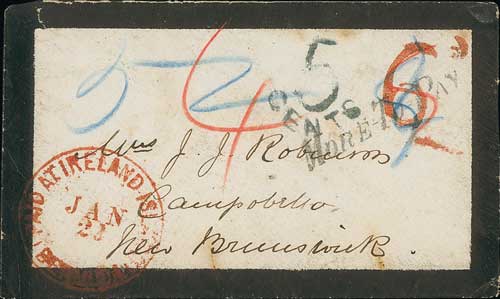 1863 (Jan 22) Mourning cover prepaid 4d to Campobello, New Brunswick with red 32mm single ring "PAID AT IRELAND ISLAND / BERMUDA" datestamp (date in two lines, no year) and "6d" rate handstamp applied in error