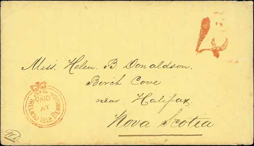 1863 (Dec 18) Cover to Miss Helen Donaldson at Birch Cover, Nova Scotia prepaid 4d with superb red "PAID / AT / IRELAND ISLE BERMUDA" crowned circle and "4d" rate handstamp, backstamped "IRELAND-ISLE / BERMUDA"