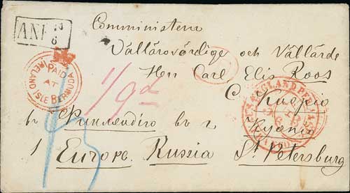 1864 (Apr 24) Cover addressed to Kupio in Finland, via St. Petersburg, prepaid 1/9 with superb red "PAID / AT / IRELAND ISLE BERMUDA" crowned circle, red oval "PD" and datestamps of Aachen (June 7) and London with