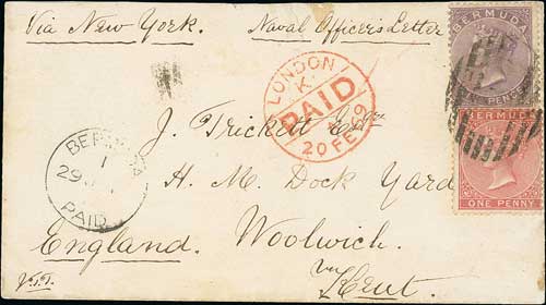 purple stamps cancelled by numeral "3" with "BERMUDA / 1 / PAID" c.d.s and red London Paid arrival c.d.s (Feb 20) on the front. A fine cover, ex Osborn. Photo on Page 108. (Image1)