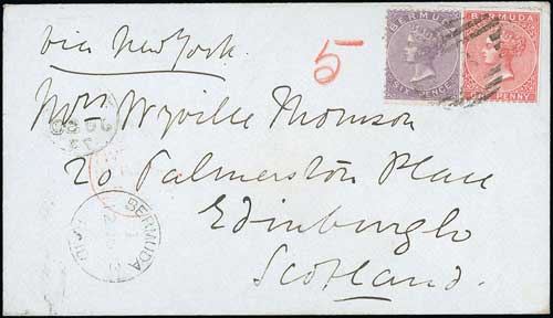 "IRELAND ISLAND / BERMUDA c.d.s applied away from the stamp which was cancelled upon arrival in London (Dec. 24). A very unusual 1d concession rate cover, accepted at the 1d rate despite being franked by a G.B stamp (invalid on mail posted into the