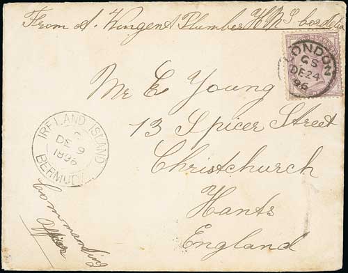 1896 (Dec 9) Cover to England headed "From A. Wingent, Plumber H.M.S Cordelia", "Commanding Officer" written at lower left but not countersigned, posted at Ireland Island unusually franked by a G.B 1d lilac, the